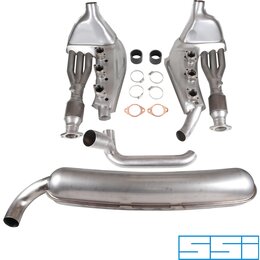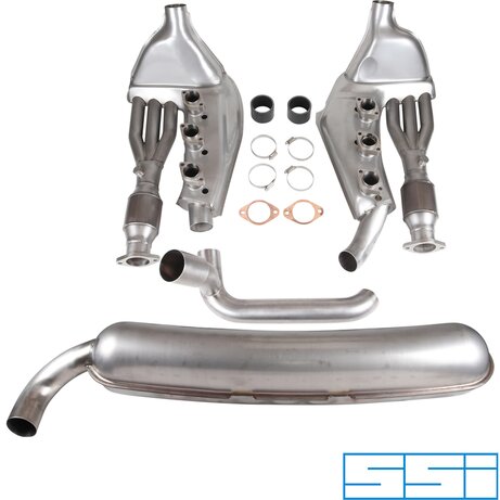 Umbau eines leistungsgesteigerten 3,2-Liter-Carrera-Motors in ein Free-Flow-System. Dieses System wurde speziell entwickelt, um mehr PS aus einem verbesserten Motor durch die Verwendung von Ø41mm Außendurchmesser Rohrleitungen in Kombination mit Ø60mm Einlass zum Auspuff zu erzeugen. Es ist nicht notwendig, das Motorblech zu ersetzen, da das System so konstruiert ist, dass es mit dem Standardblech des G-Modells passt. O2-Sensor auf der linken und rechten Seite. Alles aus rostfreiem Stahl AISI3